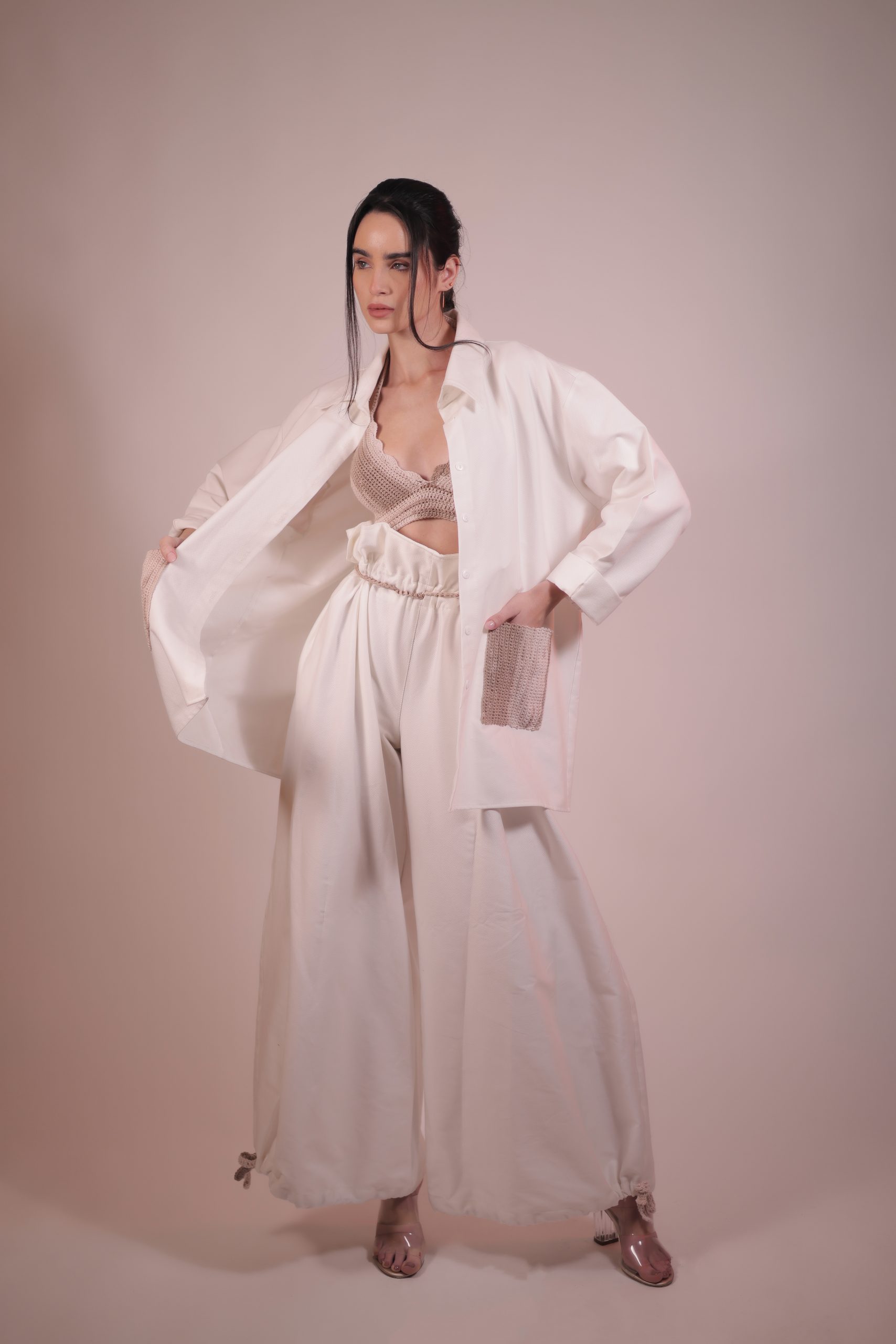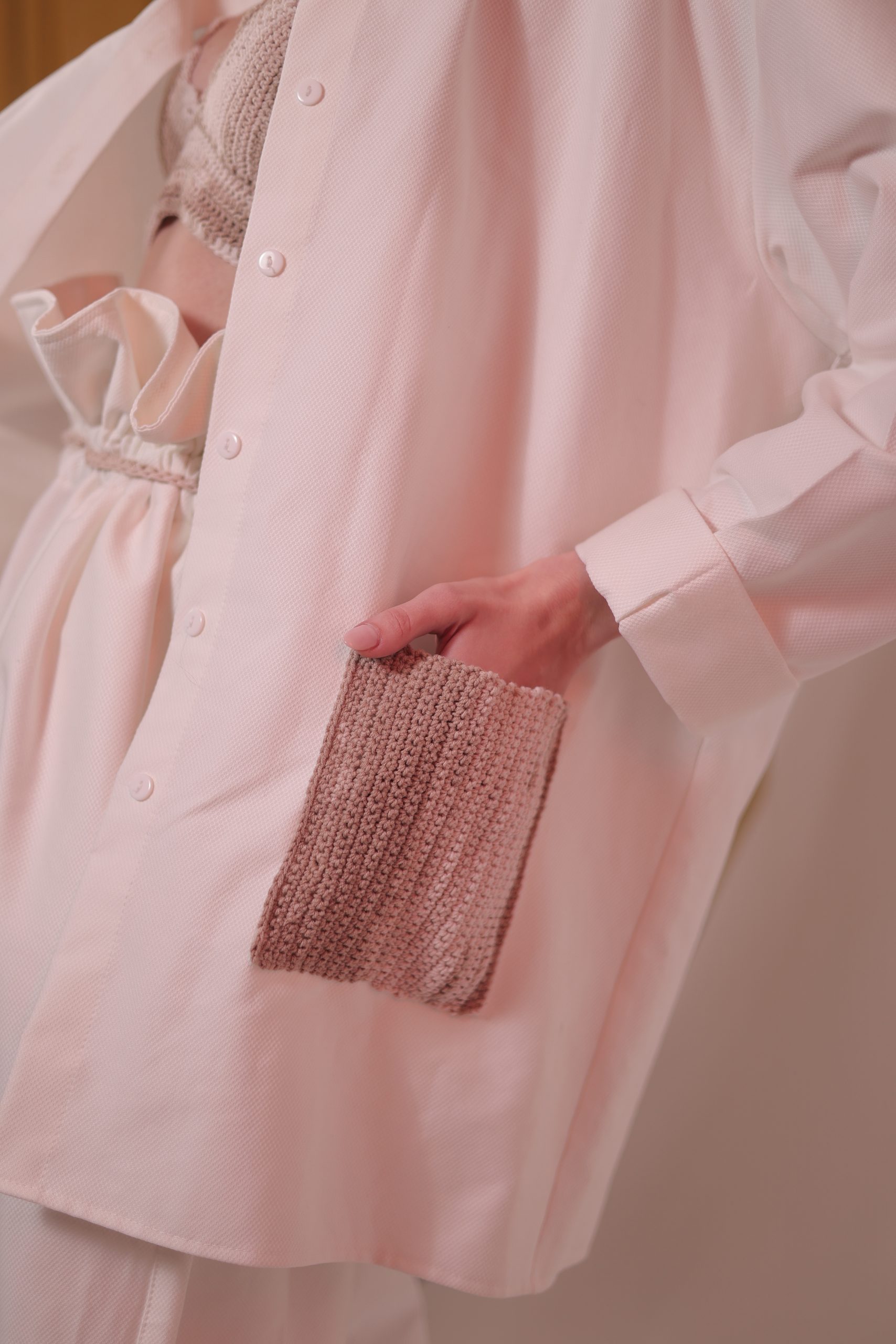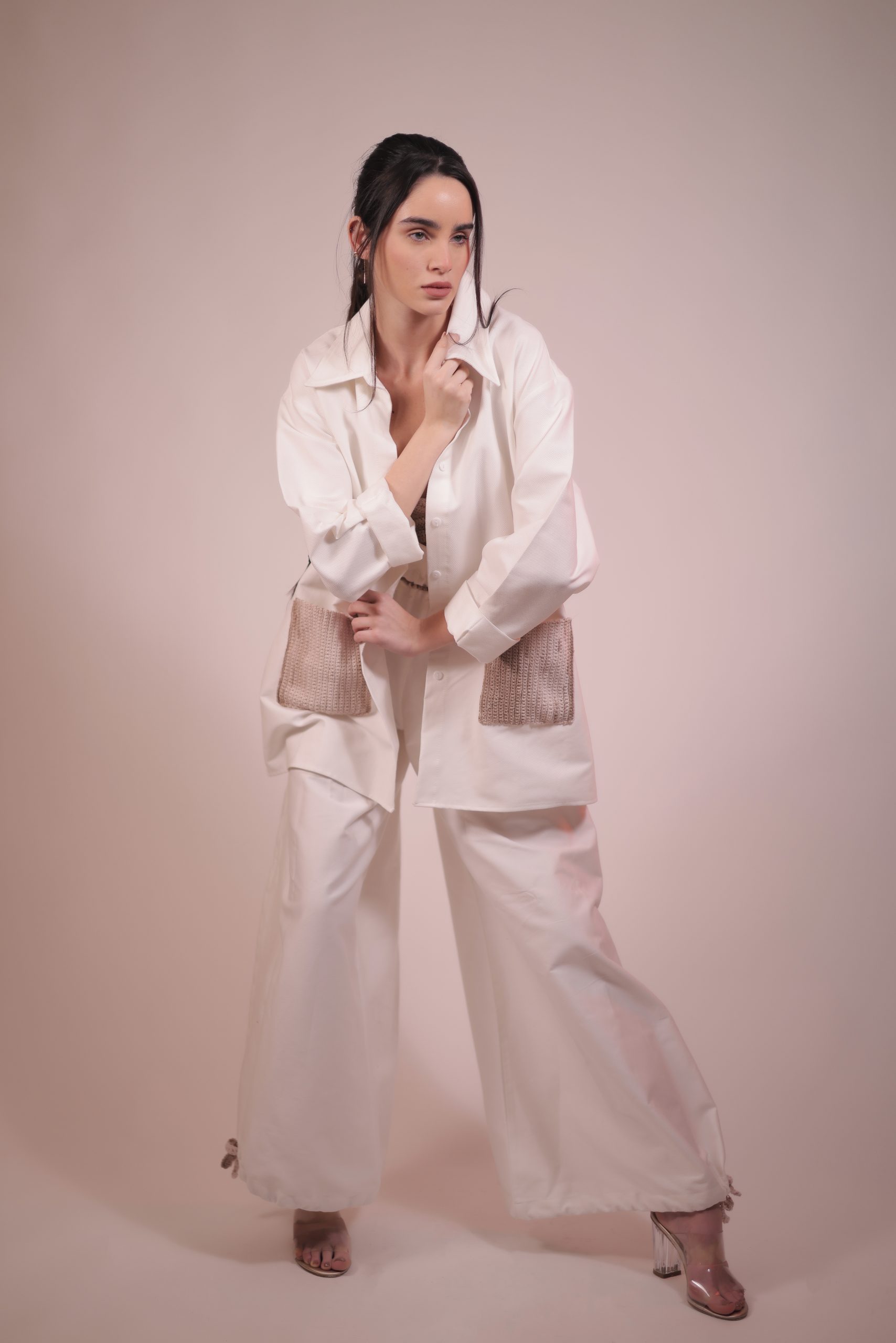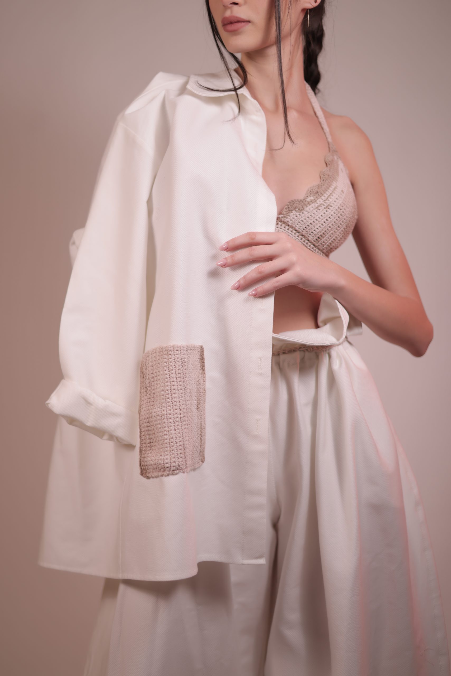 Discover timeless elegance with our exclusive white shirt, meticulously crafted to blend classic comfort with modern flair. The handmade crochet appliqué on the pockets adds a delightful contrast, making it a versatile piece for any season. Whether you pair it with jeans, skirts, tailored or our Frida pants, our crochet pocket shirt promises not just to dress you but to express your individuality on every occasion!