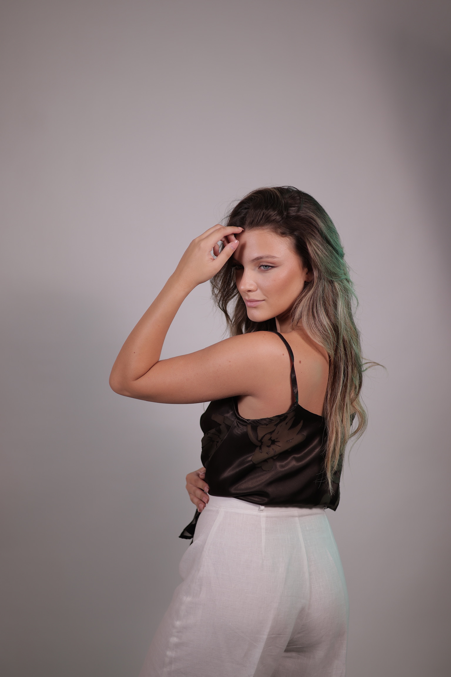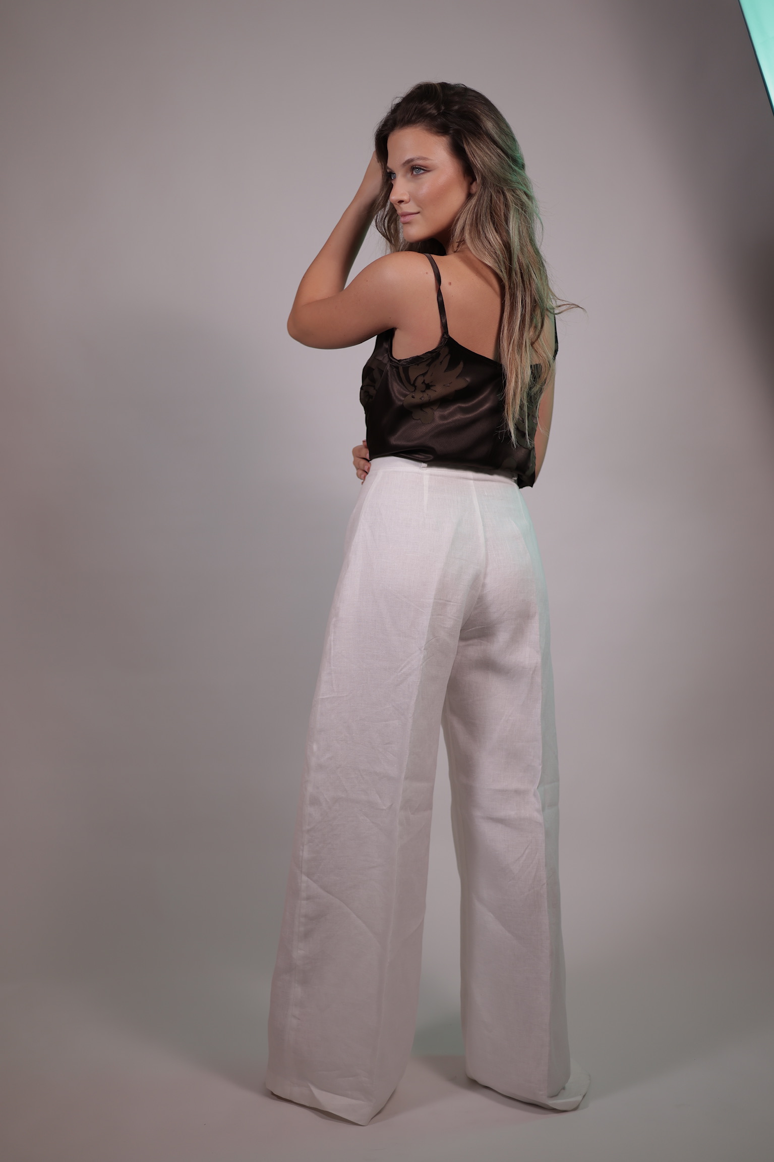 High-waist trousers with a wide-leg cut. Made from lightweight, breathable 100% linen fabric in a deep brown tone. Relaxed fit through the hips and thighs for a fluid silhouette.