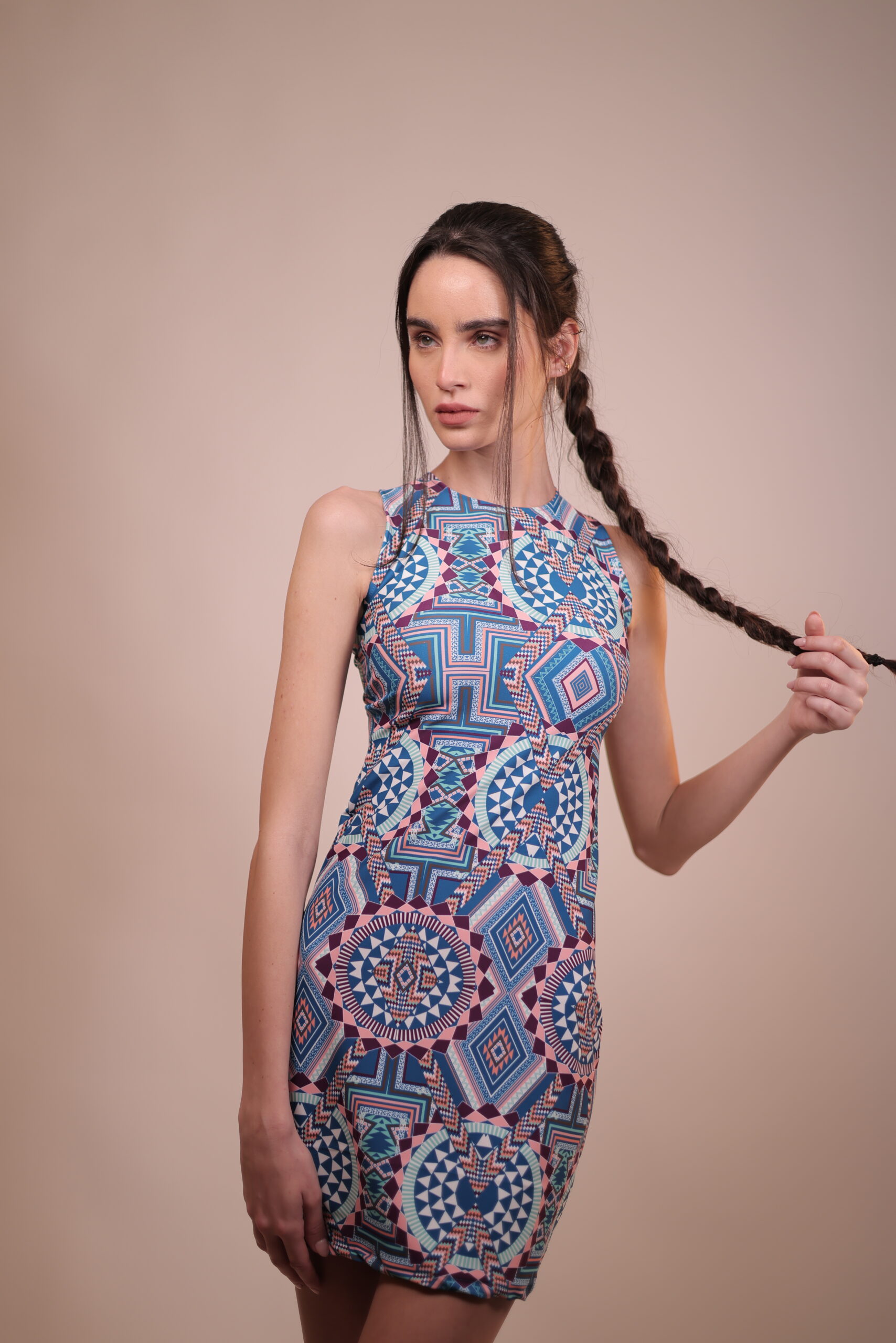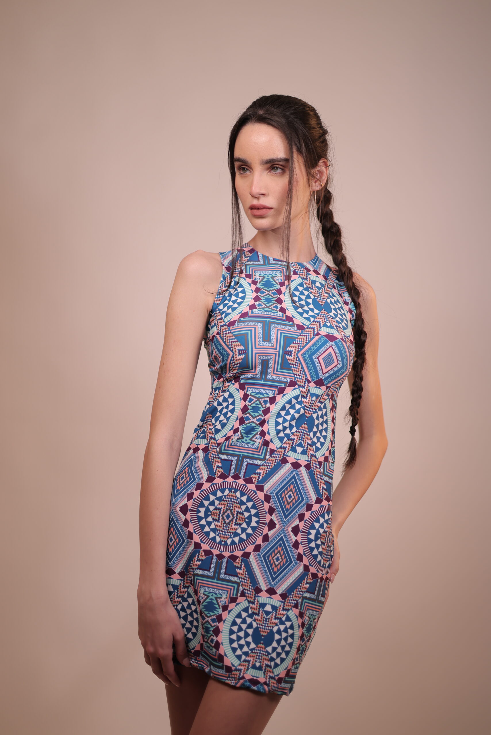 A must-have for elevating your style. Adorned with an intricate geometric pattern, this dress exudes vibrancy and uniqueness, ideal for making a statement. The form-fitting design ensures all-day comfort, whether you’re attending a summer party or enjoying a day out. Made from polyester and available in one size, the Linna Dress is a versatile addition to your wardrobe that offers both elegance and ease.
