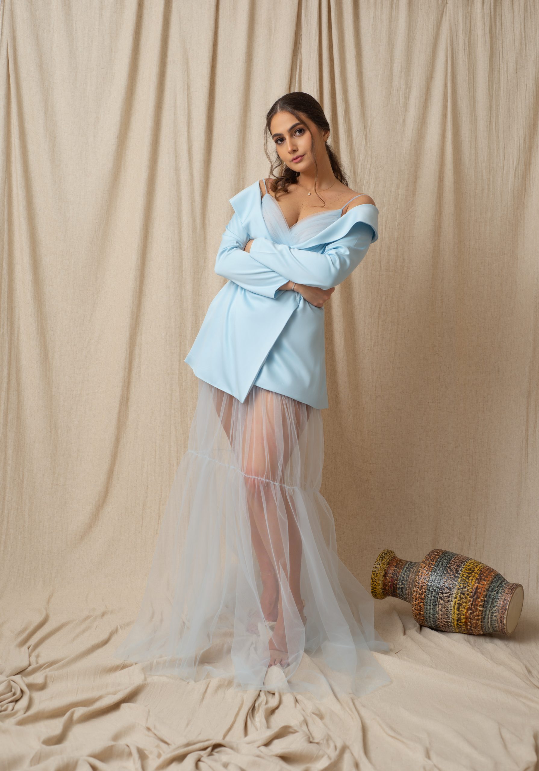 Under the sun or the moon, slay your outing with our sky blue tulle dress. Pull on the blazer when the breeze comes by and embrace that glow!